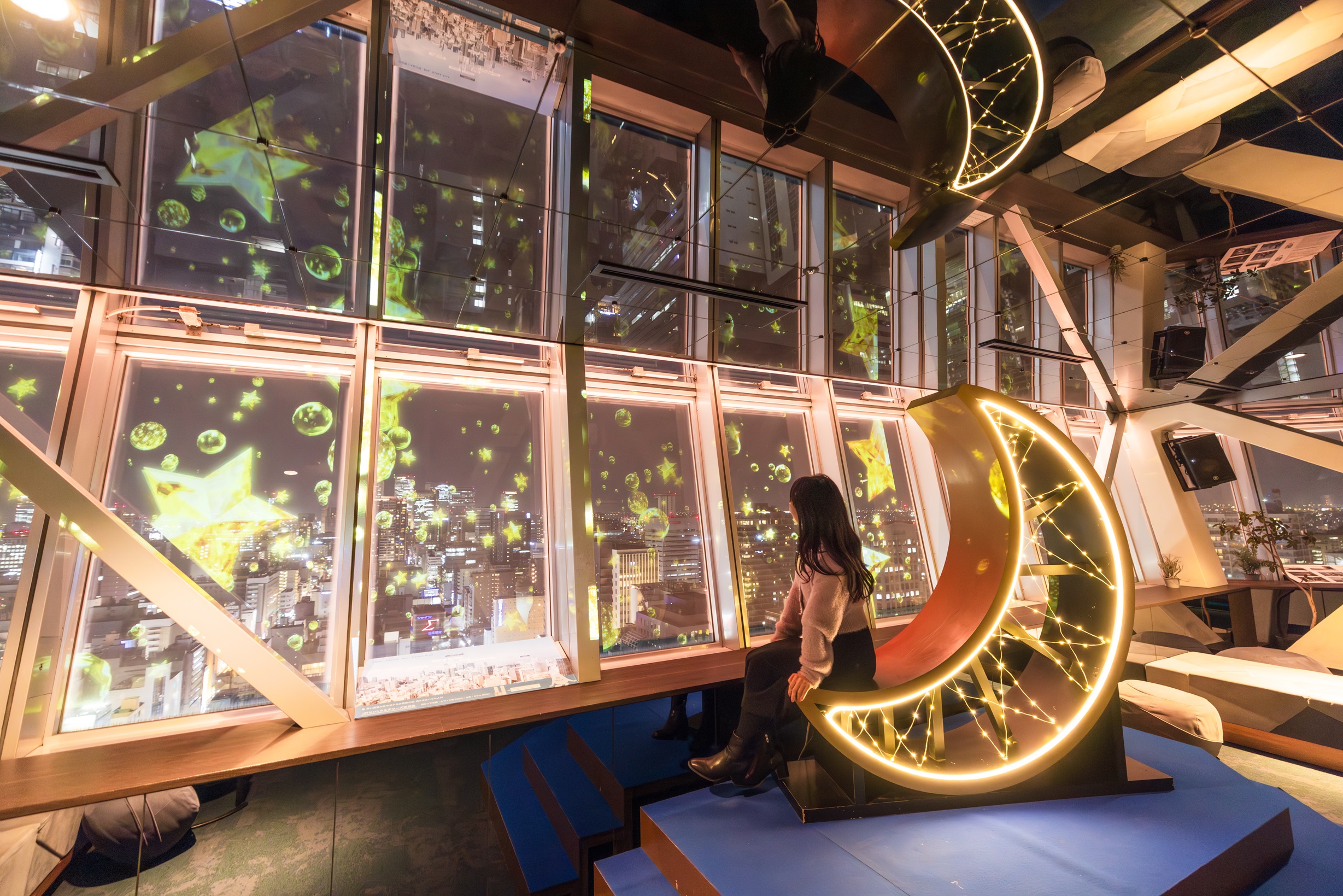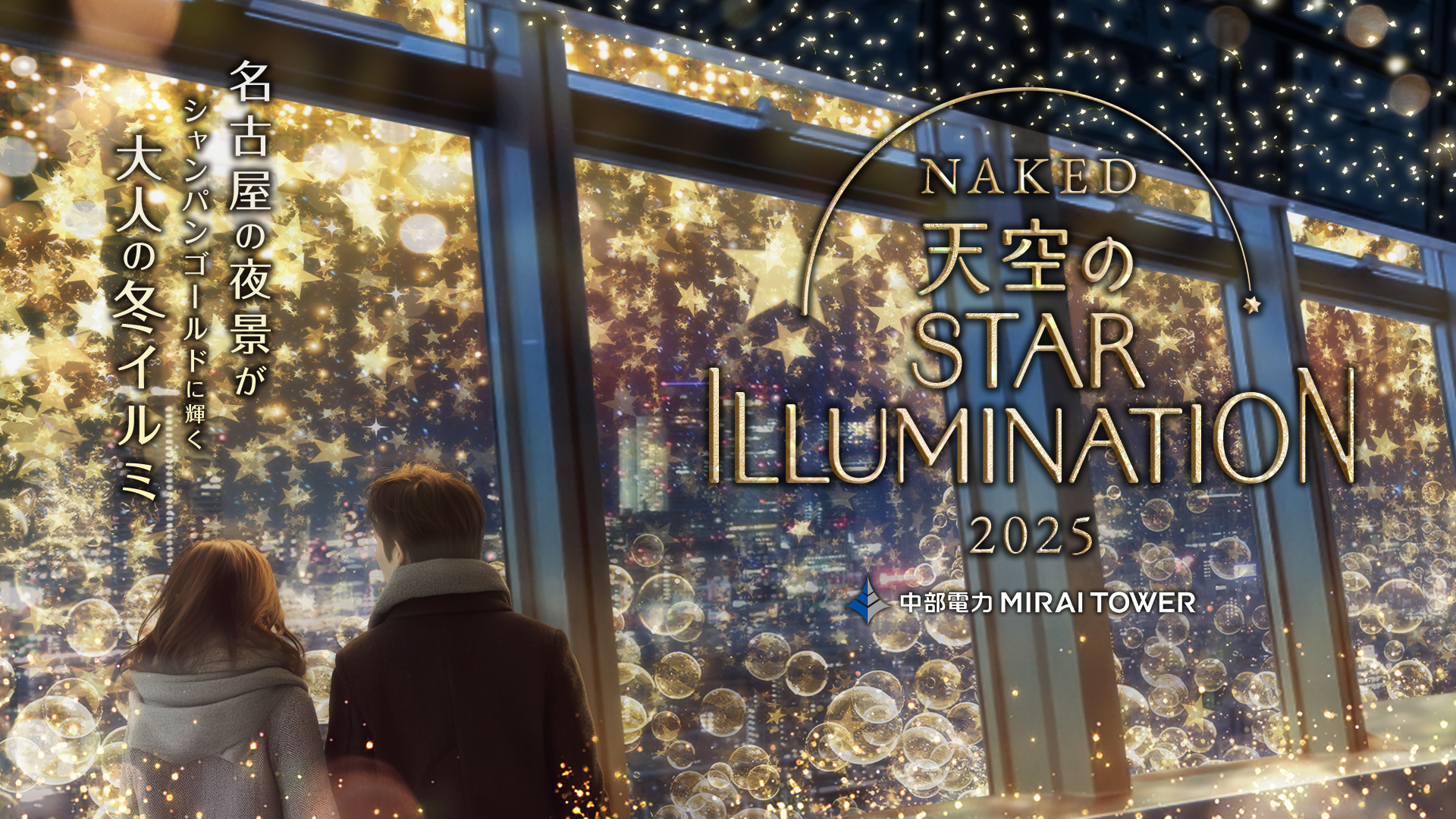 クリエイティブカンパニーNAKED, INC.(ネイキッド)が贈る大人のためのイルミネーション。中部電力 MIRAI TOWERから望む名古屋の夜景が、まるで満点の星空のようなシャンパンゴールドの光に包まれます。窓面全体を彩るプロジェクションマッピングショーや、没入感のある星空イルミネーション、まるで夜景に浮かんでいるような三日月のベンチなど、展望台全体を幻想的に彩る冬の名古屋の新しいイルミネーションスポットをお楽しみください。