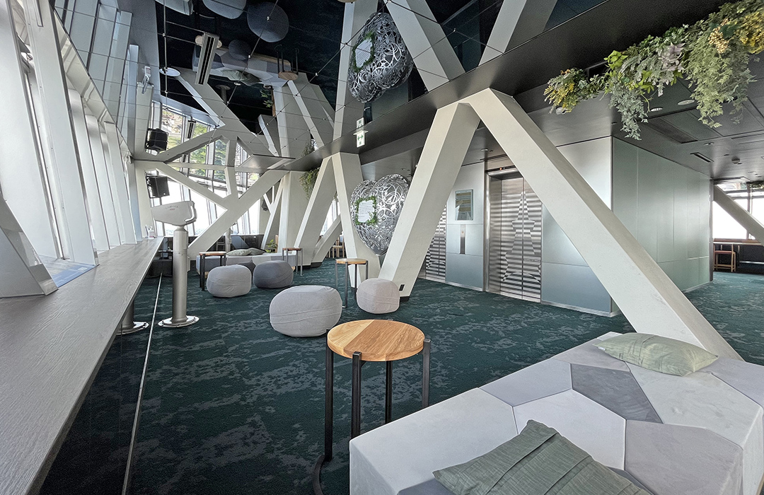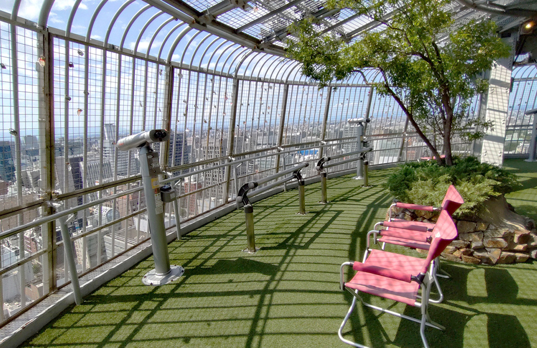 地上100メートルに位置するスカイバルコニーは、窓がない吹き抜けの空間で、開放感溢れる憩いのエリア。直接風を感じながらのびのびと景色を楽しめます。360°広がる迫力の景色をお楽しみください。